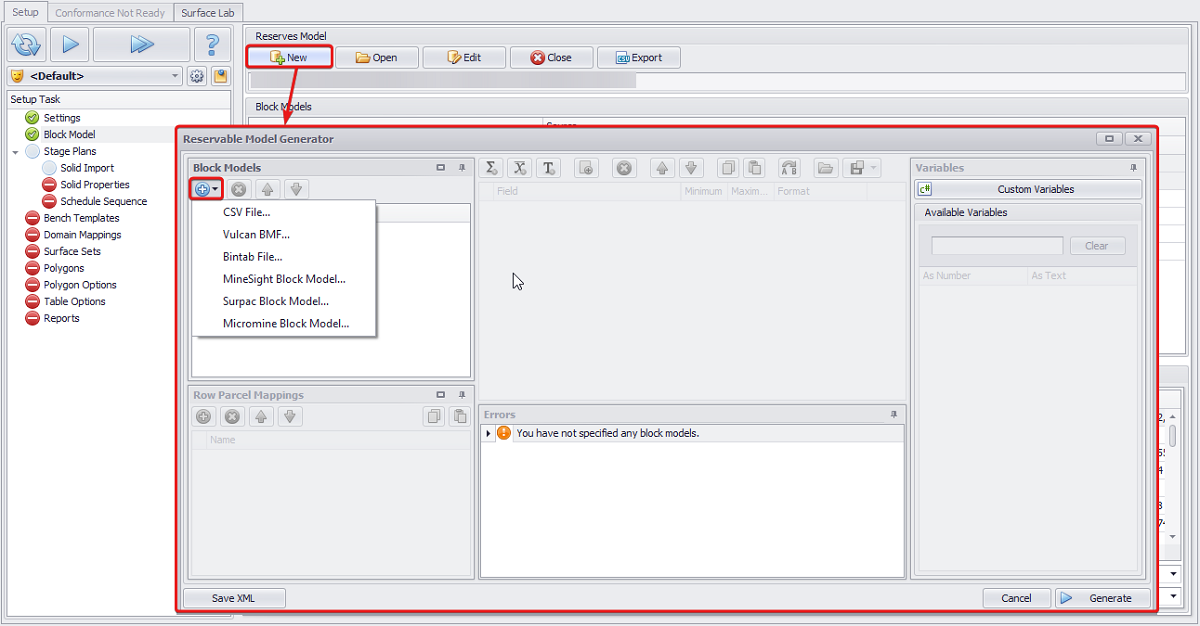 The Block Model step allows users to load in block models which can then be used for reporting purposes.