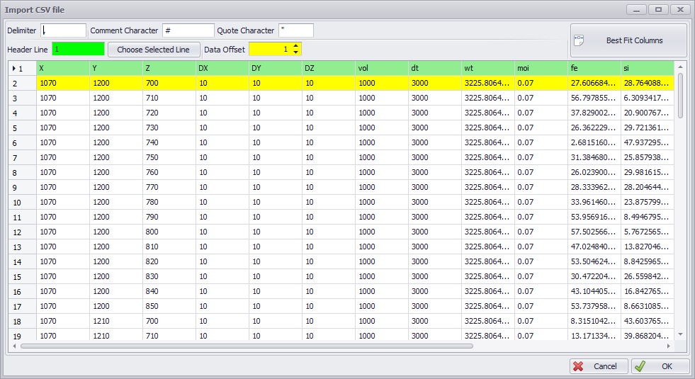 Block Model CSV preview dialog