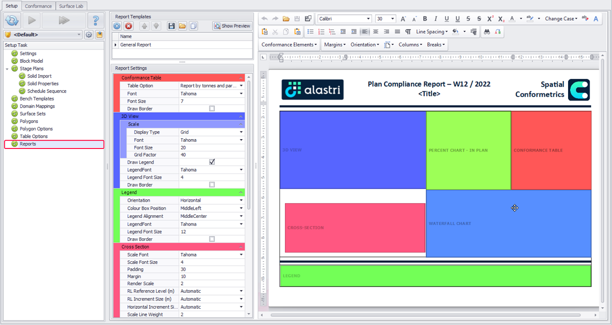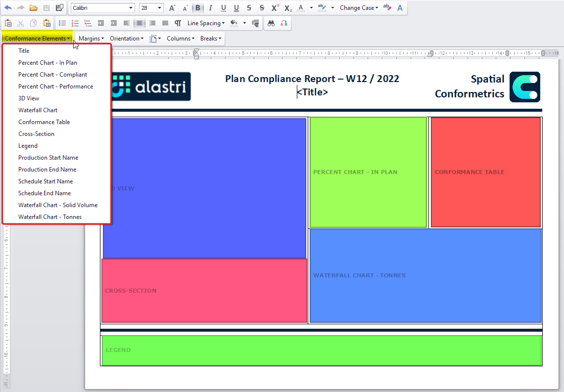 The layout of the report can be configured in the document editor on the right-hand side of the UI. The footprint of each item that will be displayed on the report page is displayed and is editable. Report items can be added through the Conformance Elements drop-down menu located in the toolbar.