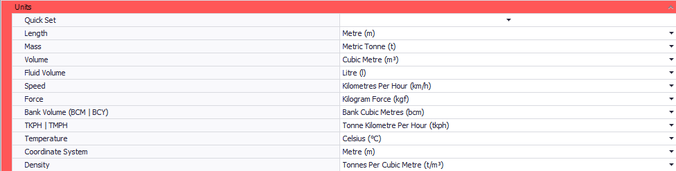 Select the units of measurement which match your site coordinate system and local standards. Use the Quick Set drop-down to select Metric or Imperial units of measurement. |