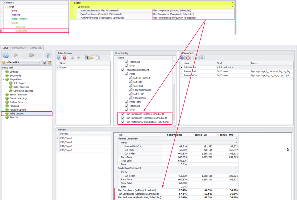 The name of the 'Compliance' report fields can be changed from their default values to a user-defined value. The names of these categories appear in the table reports. |