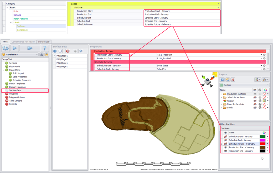 The name of the Production and Schedule surfaces can be changed from their default values to a user-defined value. The names of these surfaces appear in several places in the application. |