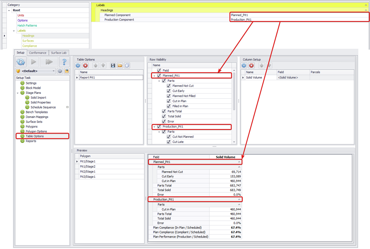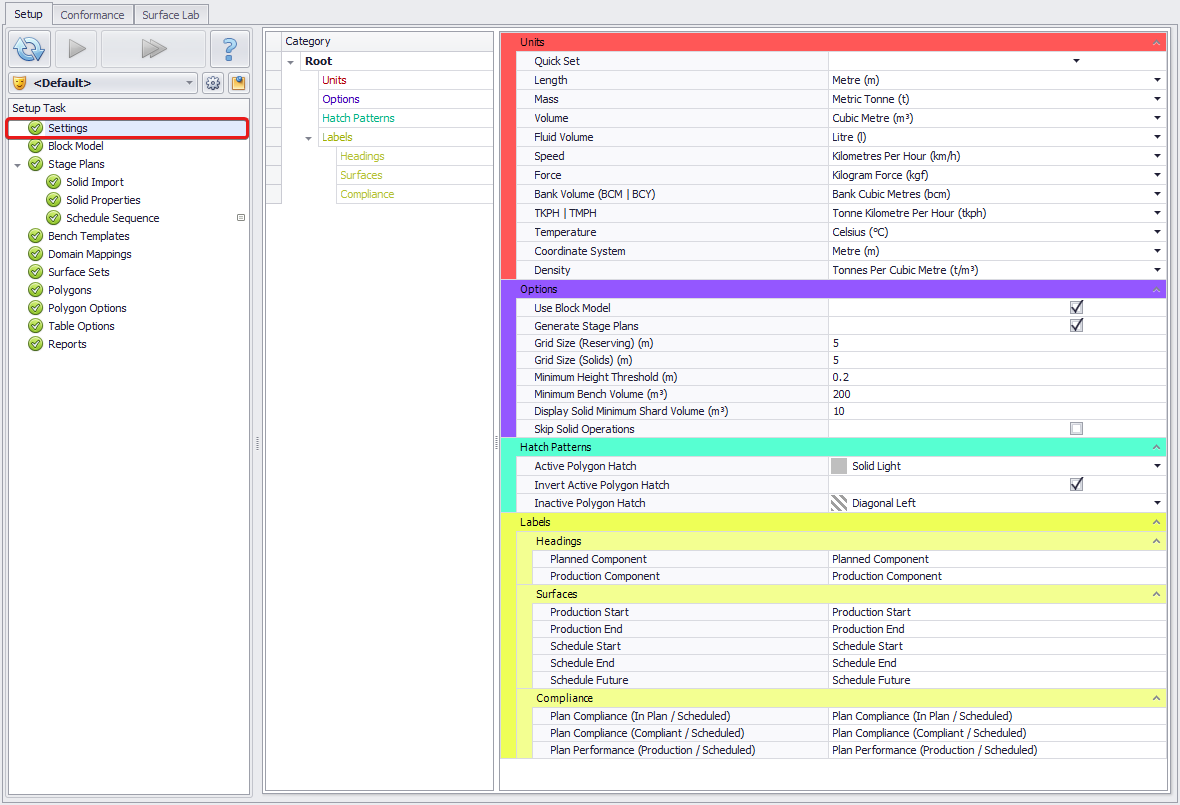 Please take note when reducing the Grid Size for Solids and Reserves that there is a trade-off in the calculation time. That is, smaller the value the longer the calculations will take. There are negligible gains to be made from reducing the Grid Size from 1 to 0.1 however, the processing time will increase significantly. The recommendation is to start with values of 5 & 5 and inspect the resultant values. If desired, reduce the Grid Size values and quantify the change in values and the time taken. From this information, you should be able to identify if any significant gains are made and if they are worth the time trade-off. |