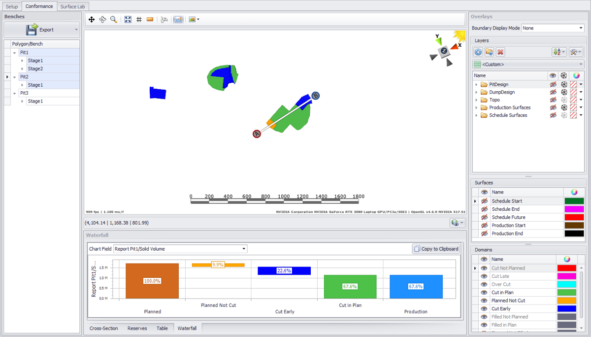 Conformance Shading Shade conformance solids based on domains, making it easy to identify planned and unplanned movement for presentations. Conformance Reports Generate conformance and performance calculations across multiple pits, material types, and block model properties using a standard pivot table format. Waterfall Charts Use the power of visual communication to show the inter-locking components of plan conformance and performance. Import/Export Export conformance surfaces, solids and reserves to “.dxf”, “.00t”, “.csv”, “.obj” and “.tridb”. |
