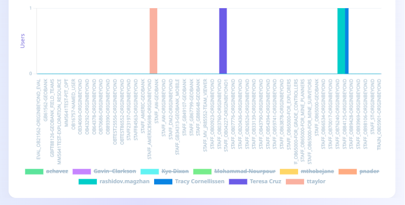 You can further limit the displayed information using the Legend label for each user. For example, if you click on a label to toggle it OFF, it will appear crossed out and the information for that user and licence will not be displayed in the graph. In the following example, all but four of the users have been removed from display: