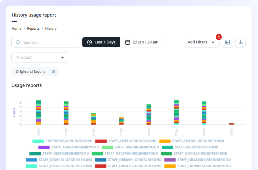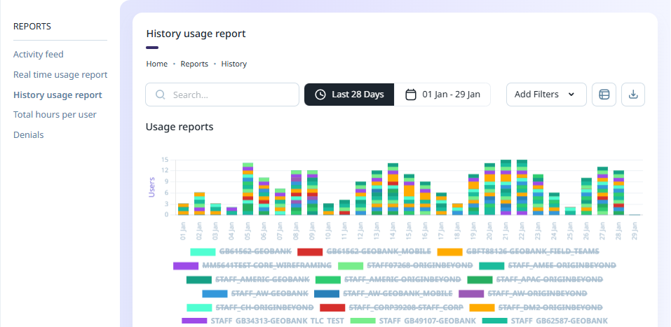 The History Usage Report tab of the Reports page provides information on the historical usage of the licence Seats configured for your Company.