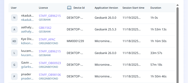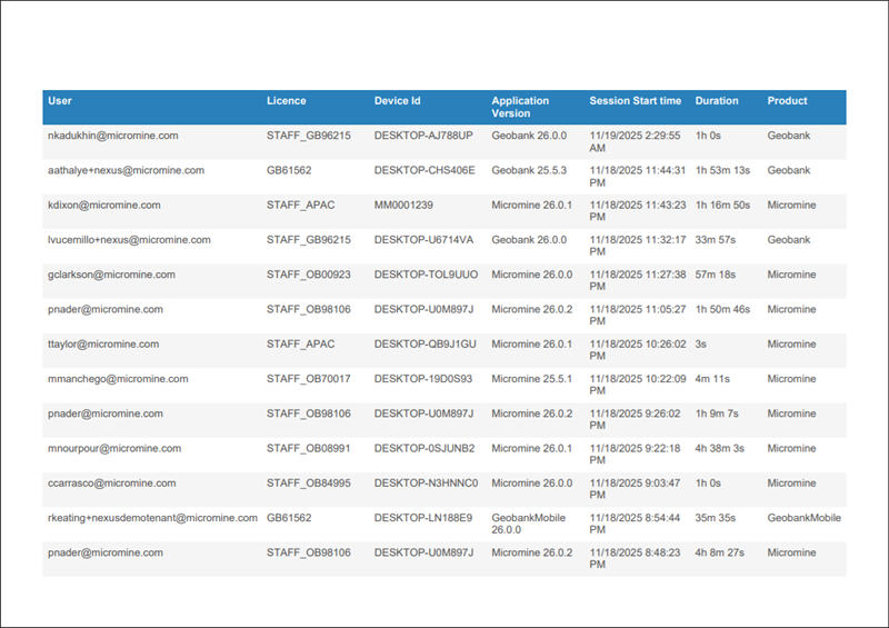 As the table shows, the Usage report contains information on each User, Device Id, Application Version, Session Start time and Duration for the use of each licence over the selected period: