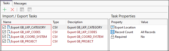 | Inactive at runtime = True | Optional | It is optional that the task be imported/exported. The task is shown alongside a check box which is unchecked by default. The check box can be checked. |