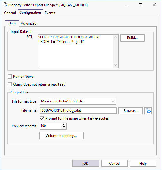 Use the Configuration tab of the Export File Specification Property Editor to build a query that will be used to retrieve an input dataset. See: New Export File Specification
