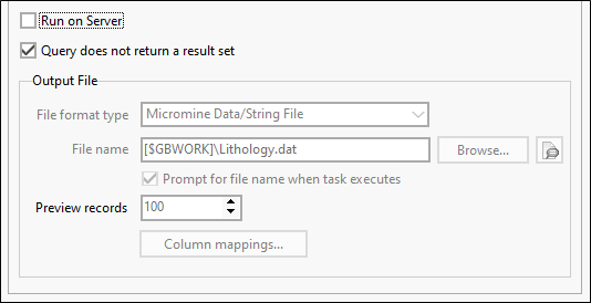This type of query is identified by selecting Query does not return a result set. When this option is selected, the output file prompts are disabled.