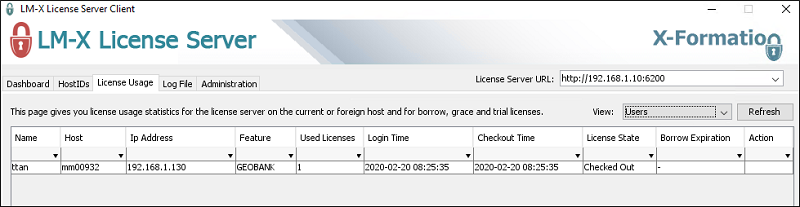 - See which users are currently using a licence or have a borrowed licence and when the borrow period will expire (Licence Usage ‘Users’ View):