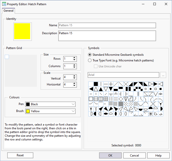 A pattern can be created using standard Micromine Geobank symbols or True Type Fonts.
