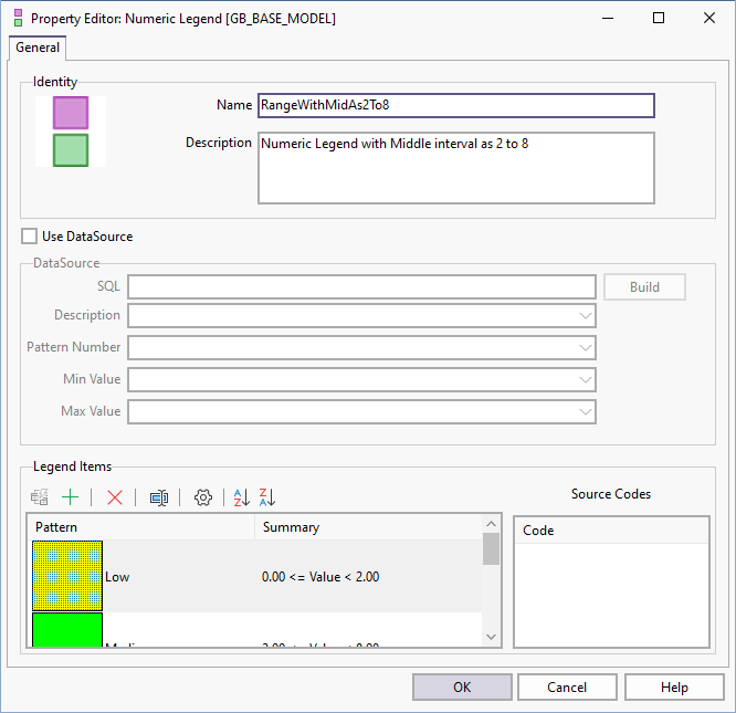 The Symbology Set Numeric Legend Property Editor is opened when you click the Properties button when a numeric legend is selected on the Legends tab of the Symbology Set Property Editor. See: Legends.