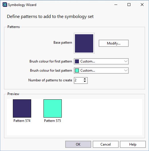 In the Symbology Wizard, you can select a pattern, select start and end brush colours to define a colour ramp, and preview the result.