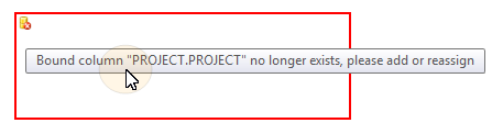 If a control is bound to a field within a dataset and the field no longer exists, a validation error is flagged (red icon) and a notification is displayed in the control tooltip: