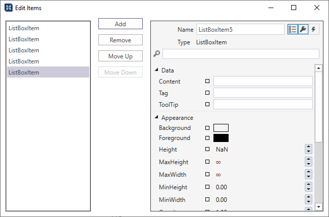 - In the Edit Items dialog, click the Add button to add items to the ListBox: