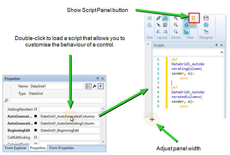 The Scripts pane allows you to modify the underlying scripts that control the behaviour of the controls you have added to a form. In the following example, scripts can be modified to customise the content of the columns in a Data Grid.