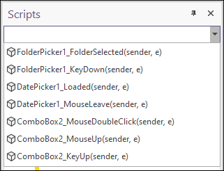 When you open the Scripts pane, and a control is selected in the form, any functions associated with the properties of that control are shown in the Scripts pane. You can navigate the script using a list of functions at the top of the Scripts pane: