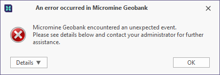 - Raise an issue with Micromine Geobank Support and ask for a time-line for resolution - if the circumstances and time-line are suitable such that other processes can continue and the failing process can be delayed, wait for the service pack which addresses the issue.