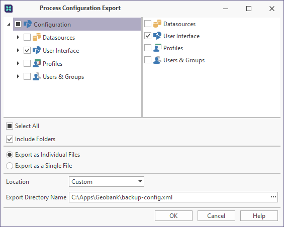 - Repeat, but this time just select the Forms and Datasets nodes under User interface and ‘Export as a single file’ – this is done as an extra backup of the current state of any Forms which have been built so that if needed these can be re-imported after the upgrade has been re-done, again as a separate set for convenience.