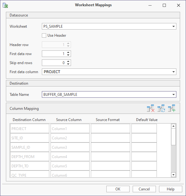 Use the Mapping form to map the rows and columns in each worksheet to the tables and columns of each datasource: