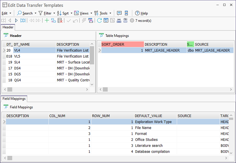 From the view, you can manage and edit the data transfer templates available in Micromine Geobank. See Working with data views.