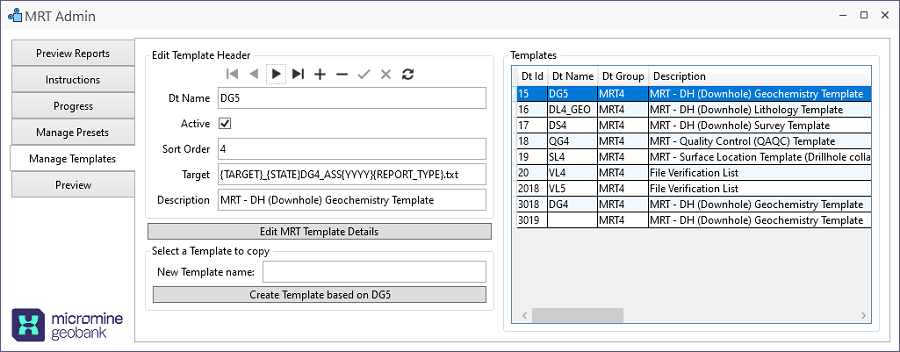 The Manage Templates tab of the MRT Admin App is used to manage the Mineral Reporting Templates setup in Micromine Geobank and edited with Data Transfer.