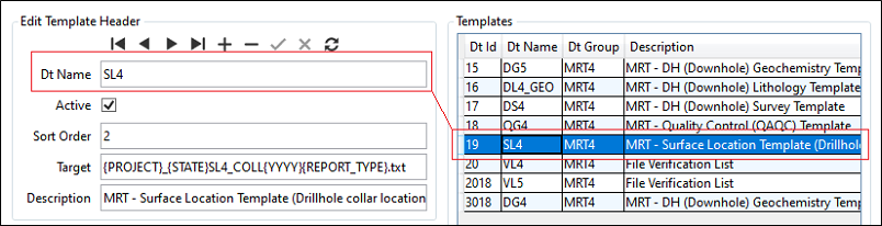 The Dt Name field displays the name of the selected data transfer template. You can change this name in the field and use the Save button in the toolbar to retain the change.
