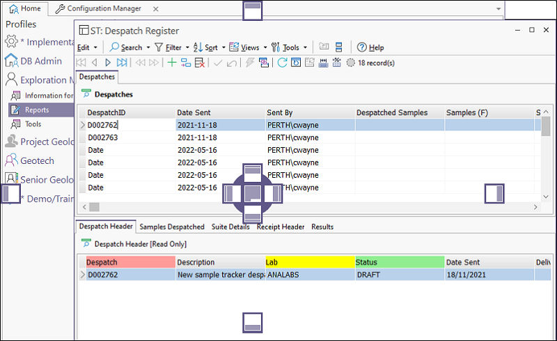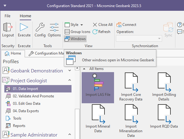 When you log in, a choice of configurations are made available to you depending on your role. The profiles that are available in your current configuration are accessible on the Home page of the main Micromine Geobank window.