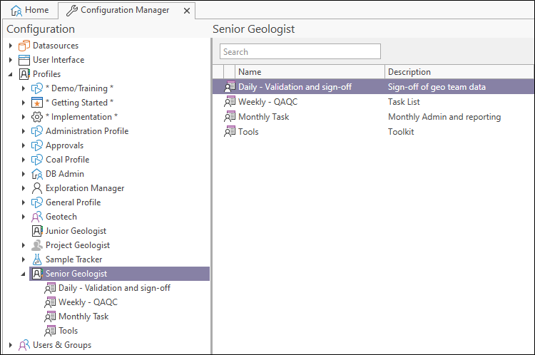 Each profile is configured as a collection of task lists. In the following example, several data views have been configured as tasks in the Data Capture task list of a Senior Geologist profile: