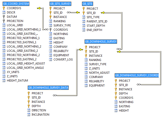 The Micromine Geobank Standard Data Model provides a very basic structure for the storage of downhole survey data and metadata. The relevant tables, as defined in the current Standard Micromine Geobank Database, are shown.