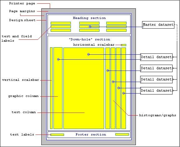 The templates (objects shown in yellow) derive their data from the datasets, which are set up in a master/detail relationship. In this case, the master dataset the drillhole header table, while the detail datasets are tables or queries which retrieve geology, mineralisation, alteration, etc. for the current drillhole.