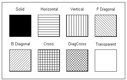 The Fill or Background style is the style of the pattern used to fill the background or enclosed areas of the template, e.g. the area inside a rectangle or the bars of a graph. Several styles are available: