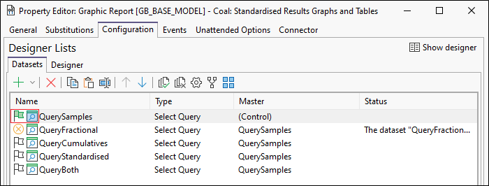 - On the Configuration tab of the Graphic Report Property Editor, click on the on the Datasets tab.