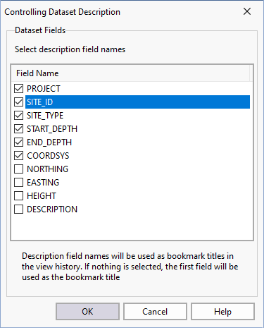 - If you select a different field in the controlling dataset (Step 4), for example End Depth, the bookmark list is updated accordingly: