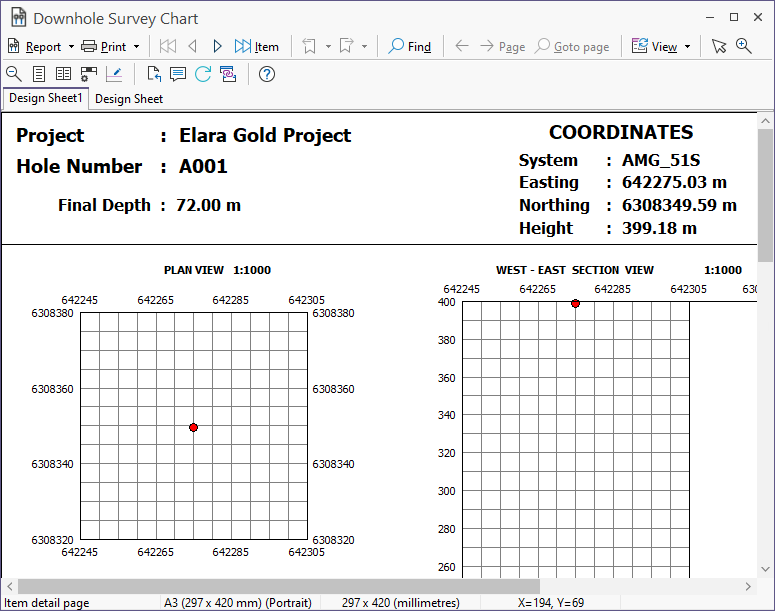Use the Find button and the Go to page button to locate a specific item, or move to a specified page for the currently selected item. In a Project Summary report, for example, an item would be a "project". For downhole graphics, an item typically represents a "drillhole" (a record in the controlling dataset). The Goto page function is only relevant in cases where a report generates more than one page per item, and where the paging is controlled by a scale bar. |