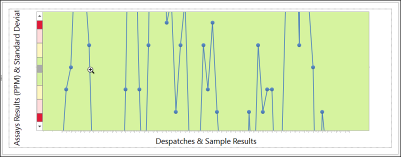 A Shewhart chart plots data points as they relate to the certified nominal value and standard deviation, for an analyte in a specific Standard or Certified Reference Material sample. In Micromine Geobank the Shewhart chart shows two upper and lower standard deviations of the nominal value. The chart is used to detect and measure variations or deviations in the data, and thus provides assurance that the quality control processes in the laboratory are of a high (QA/QC) standard, and thus, other results from the batch/laboratory may be taken as accurate.
