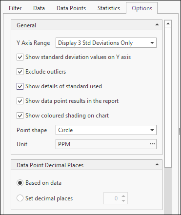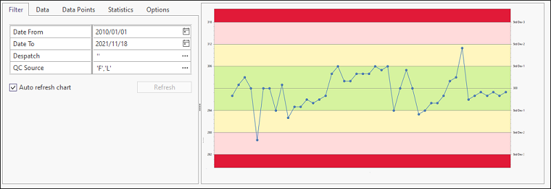 Use the Options tab to customise the appearance and the range and scale of the chart. You can set various options to determine what is shown on the chart and in the QC report. The report is accessed by clicking “Report” on the ribbon menu.