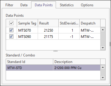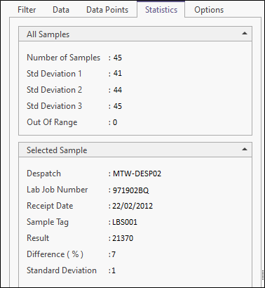 On the Data tab you can select which despatches to include on the chart. A sample count (the number of data points per despatch) is provided.