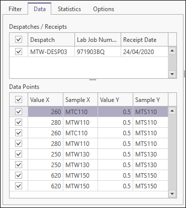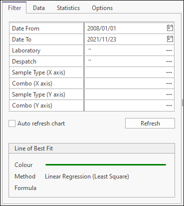 Use the Filter tab to select the laboratories and the despatches you want to include on the chart. You can filter by sample type and element combo on the X and Y axes.