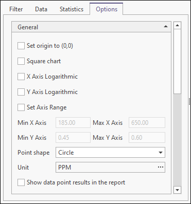 Use the Options tab to customise the appearance and the range and scale of the chart. You can set various options to determine what is shown on the chart and in the QC report. The report is accessed by clicking “Report” on the ribbon menu.
