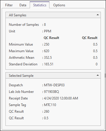 Summary statistics and selected sample information are shown on the Statistics tab. You can also select a data point in the chart window to view the details for a selected sample: