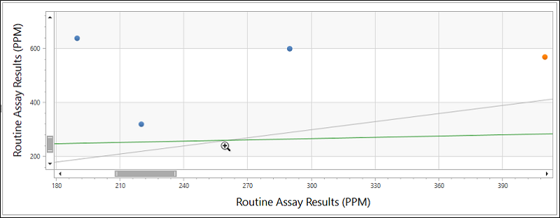 The XY chart is similar to the other charts; however, the chart display is simplified due to the absence of the confidence monitor and other QC elements. The chart simply displays the values of one combo (X axis) against another (Y axis). To help identify bias, a linear regression line (line of best fit) and a 1:1 line are shown.