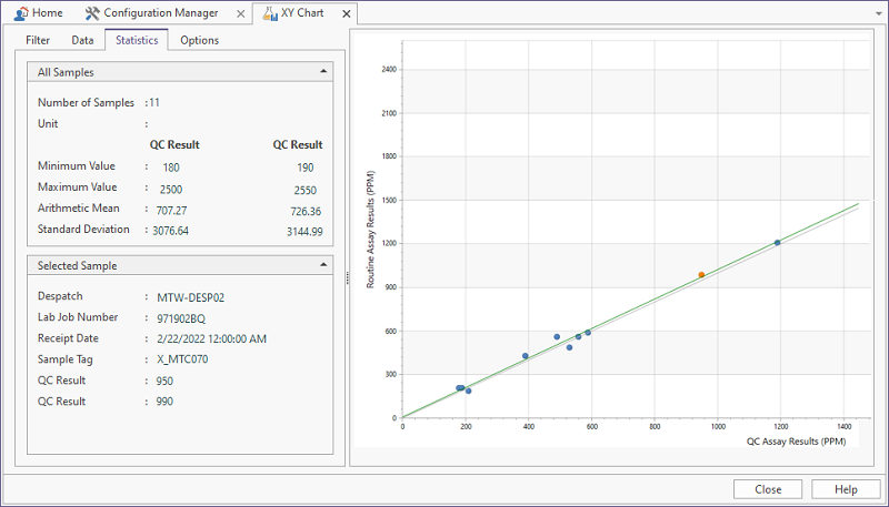 Although the XY chart is not strictly speaking a QC chart, it is often used as an additional validation tool and is therefore included under the Sample Tracker node for the sake of convenience. However, there is no "in line" equivalent (i.e., the XY chart is currently not accessible as part of the receipt process.)