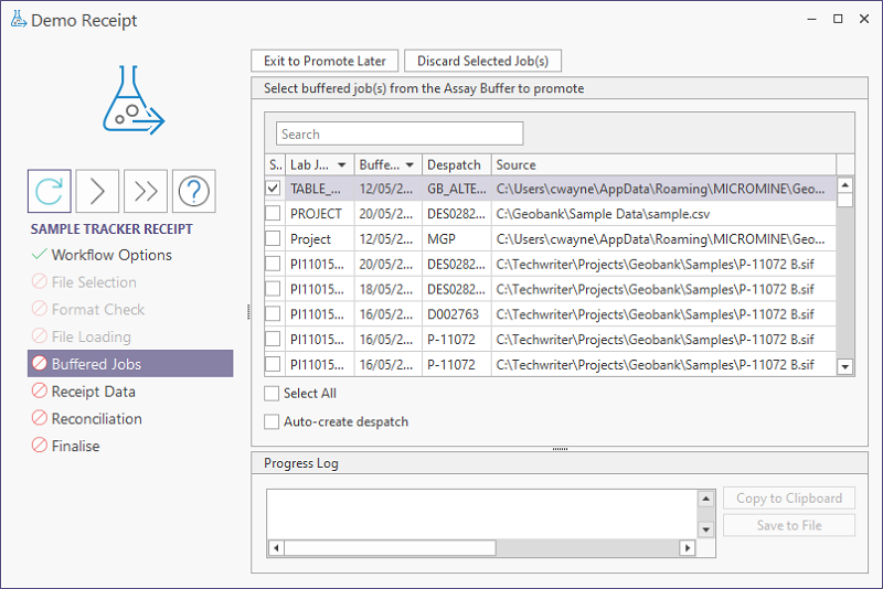 The Exit to Promote Later button will close the receipt wizard without promoting any of the jobs that have been loaded to the Assay Buffer. This provides an opportunity to check the metadata or QAQC or undertake ETL with the metadata using tools configured on your system. Jobs can be updated or corrected before promotion to the main tables.