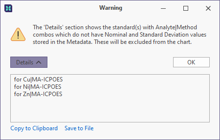 If details of the standard are missing, Analyte|Method combos which do not have Nominal and Standard Deviation values stored in the metadata will be excluded from the chart. The following warning message is displayed. Click on the Details button to see a list of excluded Analyte|Method combos: