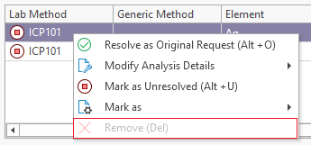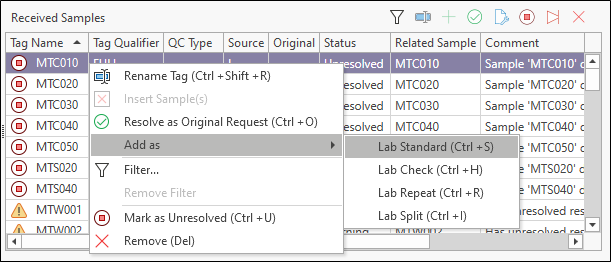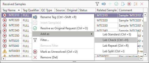 To identify the unresolved sample as a lab check, right-click and choose the Add as lab check option from the right-click menu.