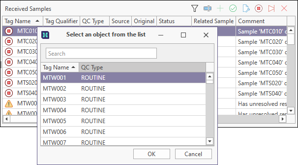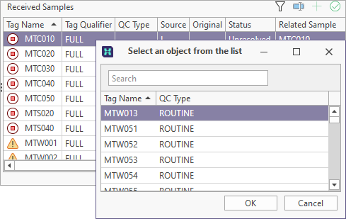 Sample Tracker will check that each sample received is in the list of despatched samples. Conversely, it will also check that each despatched sample has been received. If a sample is not present in the Receipt file, a warning icon is displayed and the sample is flagged as unreceived.