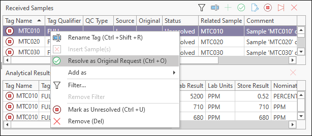 Mark as unresolved. This will reset the status of the sample to “Unresolved". Unresolved samples are ignored when the receipt is processed. | CTRL+U |