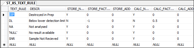 Text rules are used to determine the values for STORE_RESULT and CALC_RESULTthat will be stored in the results table. These values are usually determined by using a calculation based on the lower detection limit.